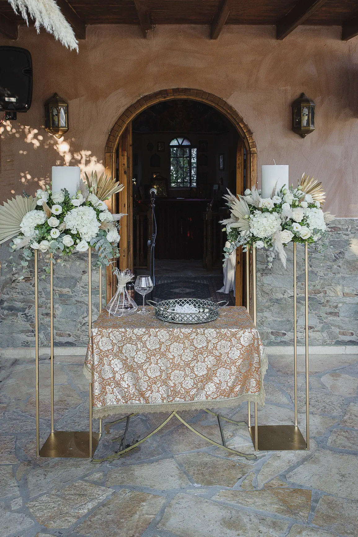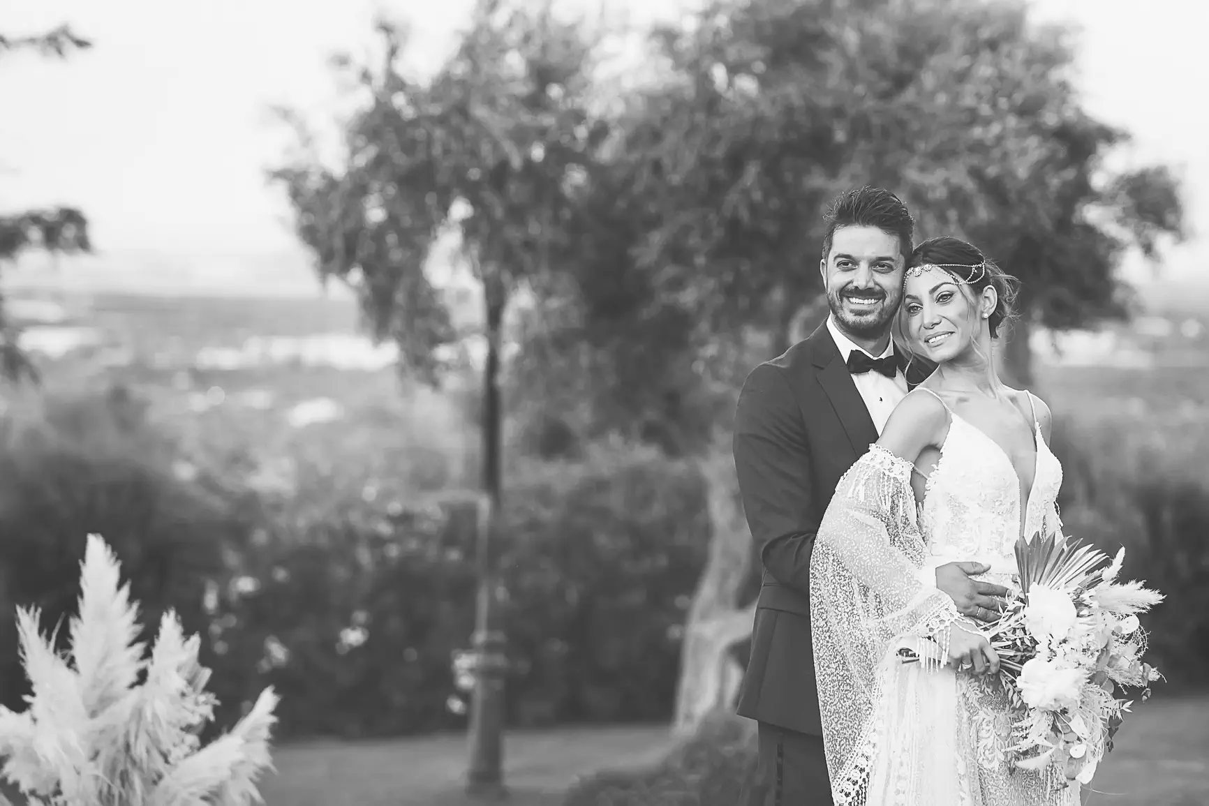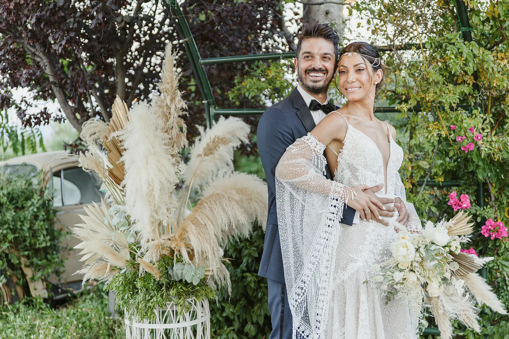 This authenticity also characterized their wedding day. Wedding photography has the unique power to “freeze” time, and the camera captured every magical moment. Eirini glowed in her boho bridal creation with its regal lace, while the celebration was hosted at the wonderful Ktema Dikaioulia in Koropi. The decoration followed impressive boho chic rhythms: white flowers, pampas grass, golden details, and a majestic white protea in the bridal bouquet. The party that followed was vibrant, with the Facebooth providing countless moments of laughter for the guests, leaving behind all the difficulties of the pandemic.