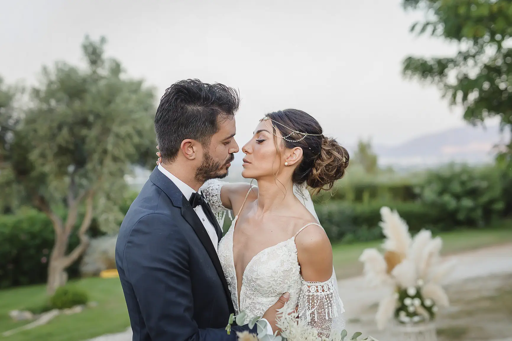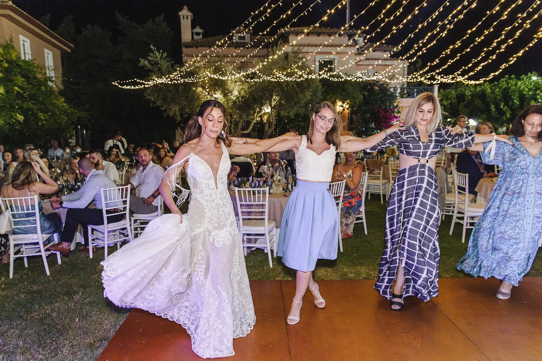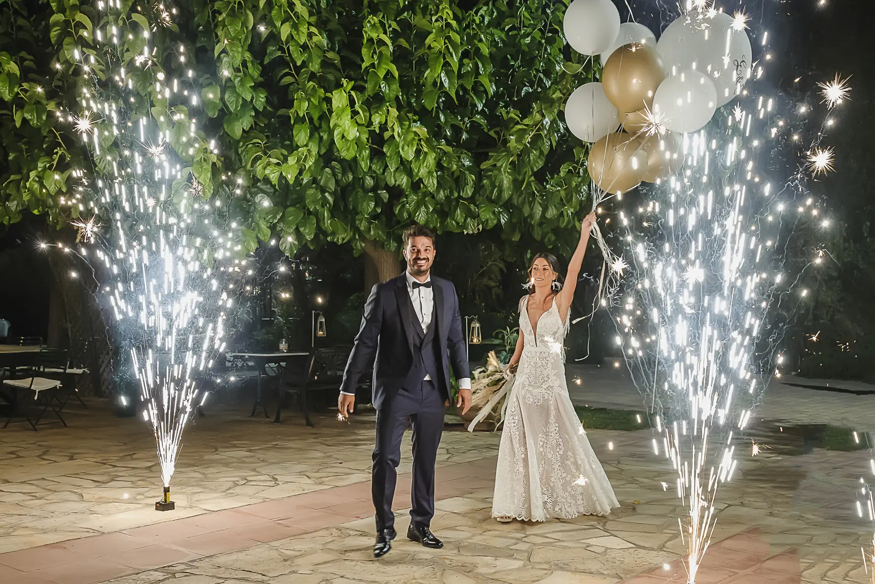 This authenticity also characterized their wedding day. Wedding photography has the unique power to “freeze” time, and the camera captured every magical moment. Eirini glowed in her boho bridal creation with its regal lace, while the celebration was hosted at the wonderful Ktema Dikaioulia in Koropi. The decoration followed impressive boho chic rhythms: white flowers, pampas grass, golden details, and a majestic white protea in the bridal bouquet. The party that followed was vibrant, with the Facebooth providing countless moments of laughter for the guests, leaving behind all the difficulties of the pandemic.