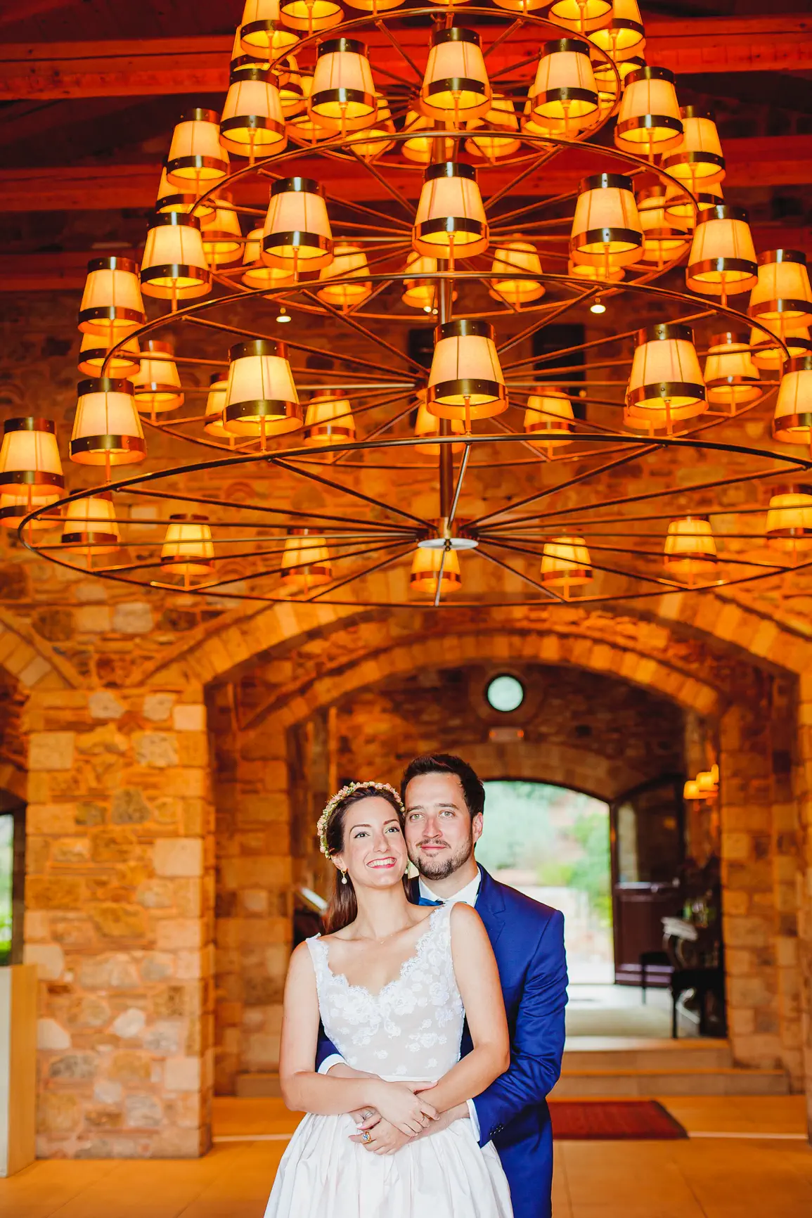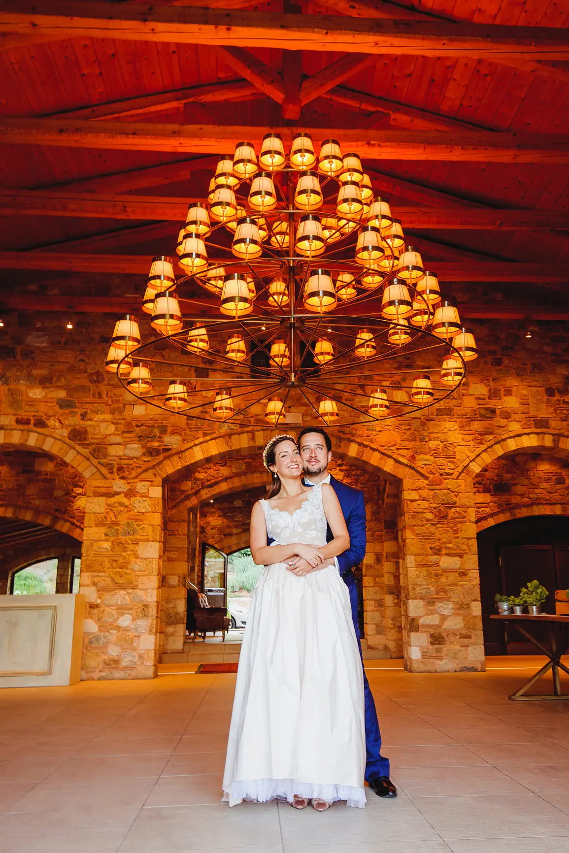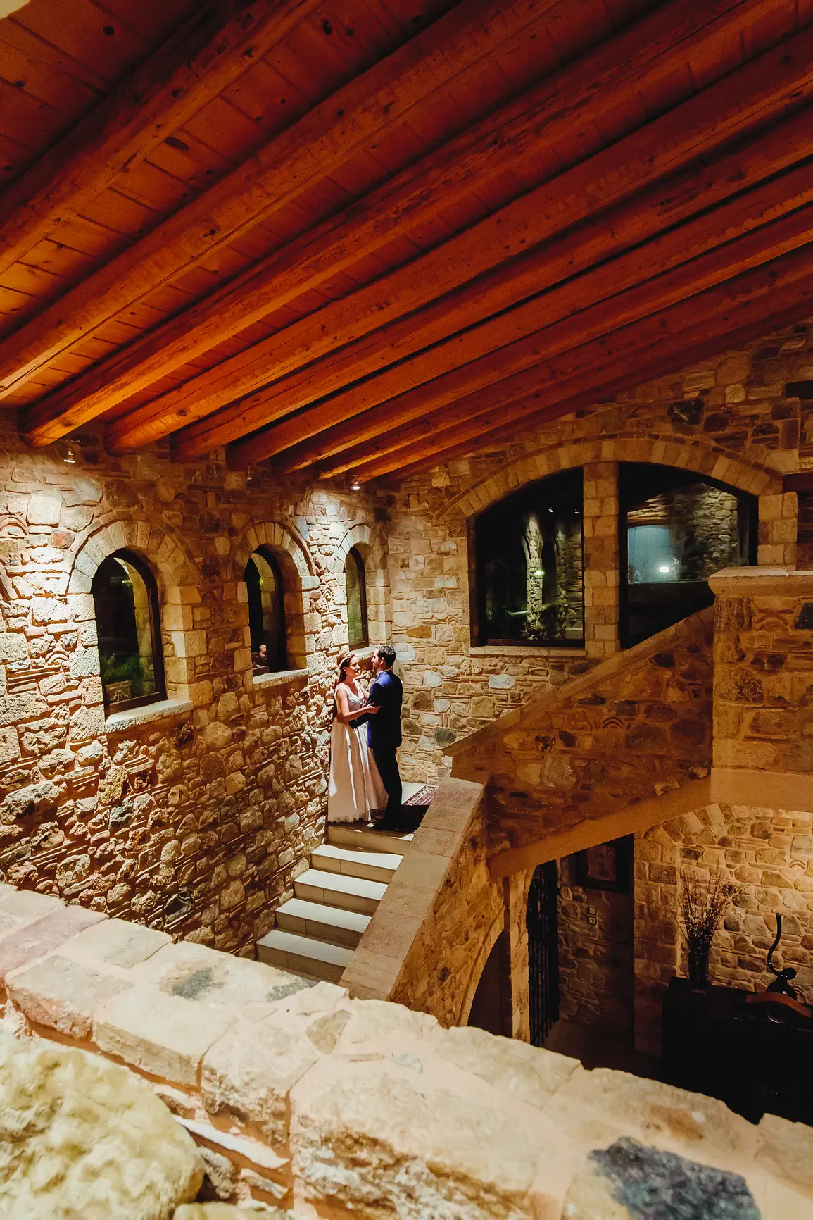 It was an evening that seemed straight out of a fairy tale, with a full moon bathing Pyrgos Petreza in its silver light. The beautiful stone building, with its stately gardens, transformed into the ideal setting for Dani and Christianna’s fairy-tale wedding. The atmosphere was magical, filled with anticipation and emotion, as the elegantly dressed guests filled the spaces, creating a warm, joyful buzz.