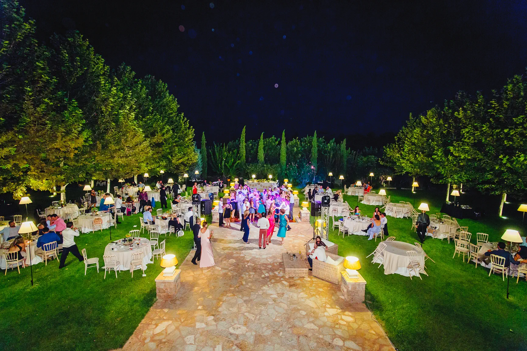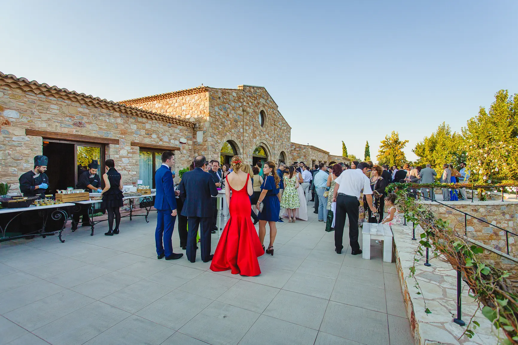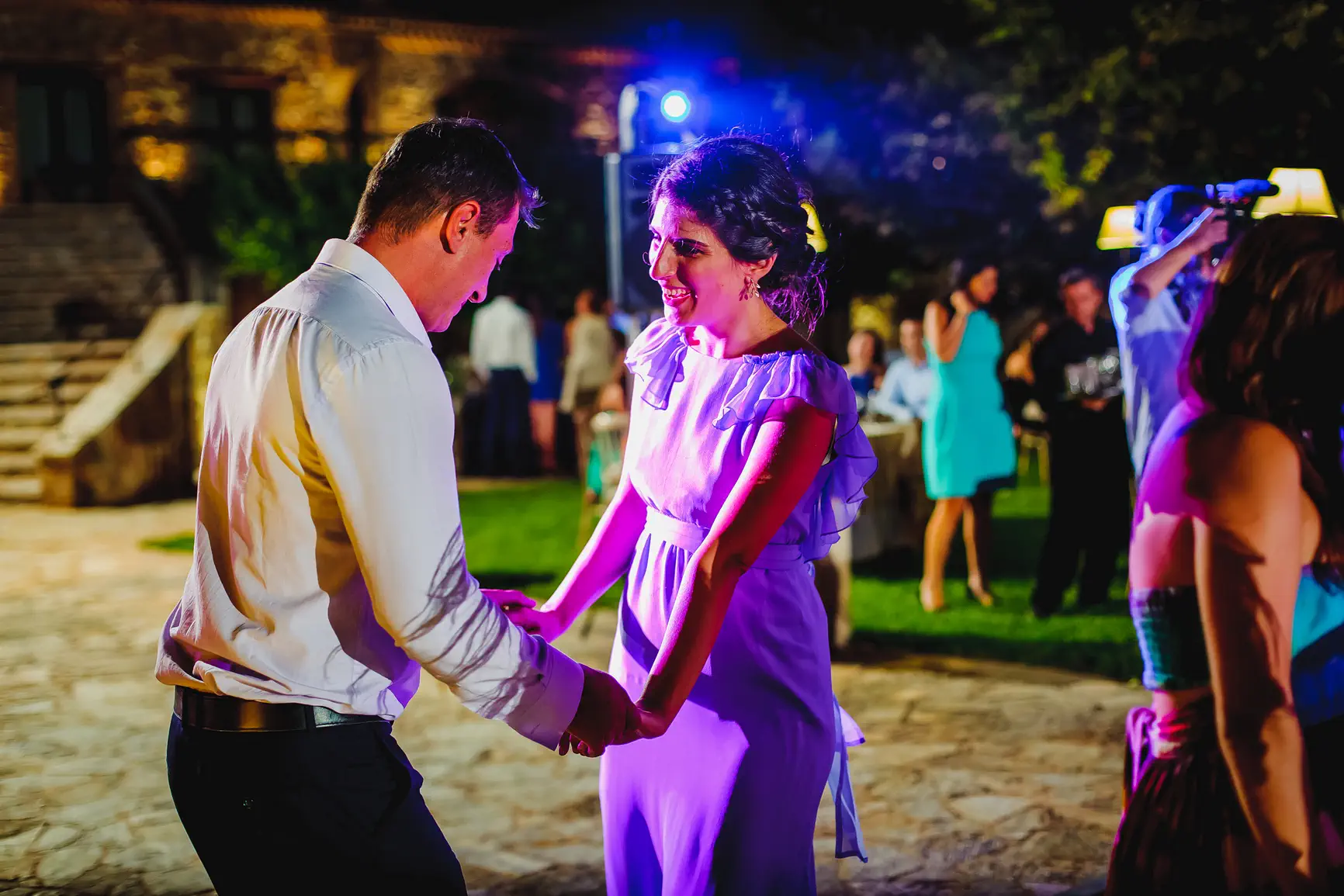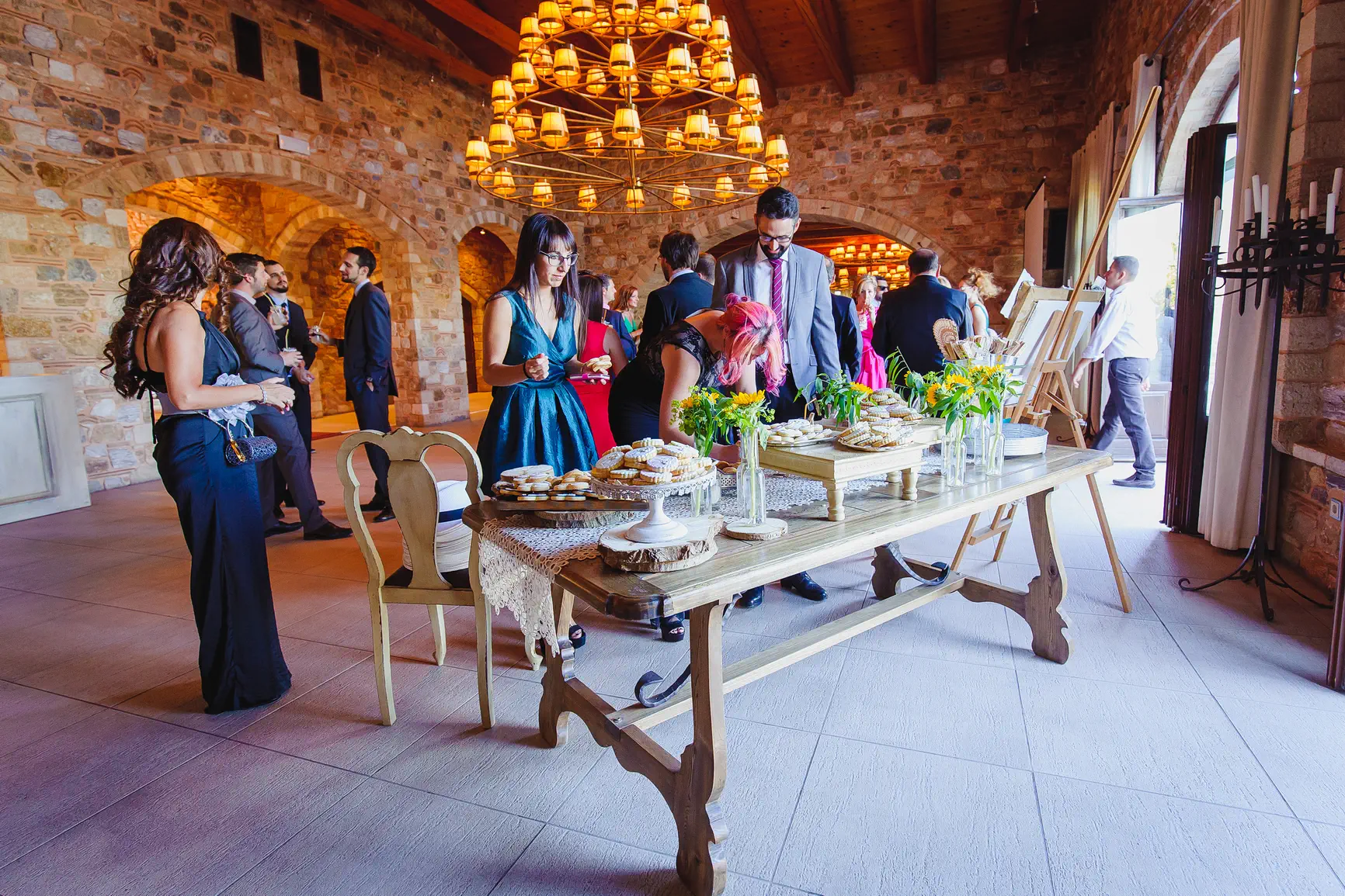 Immediately after the ceremony, the atmosphere became electric and the excitement ignited. A wild celebration began, with music flooding the lush gardens, calling everyone to dance. Laughter, wishes, and joyful voices merged into an endless rhythm as guests gave themselves over to absolute enjoyment. Exquisite food and fine drinks flowed abundantly, complementing the sense of unlimited bliss. Pyrgos Petreza vibrated with their liveliness, with dancing and singing continuing until the early morning hours.