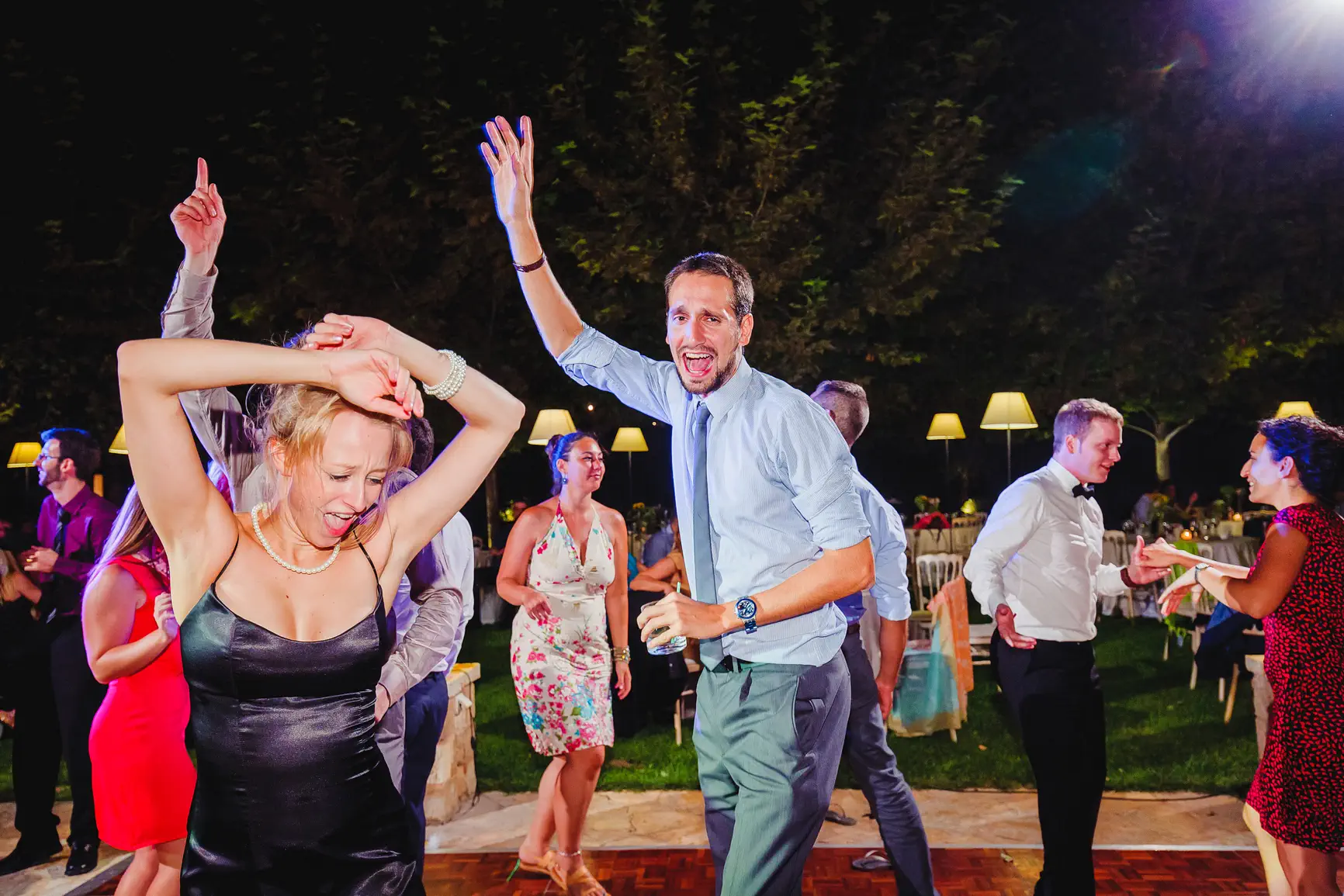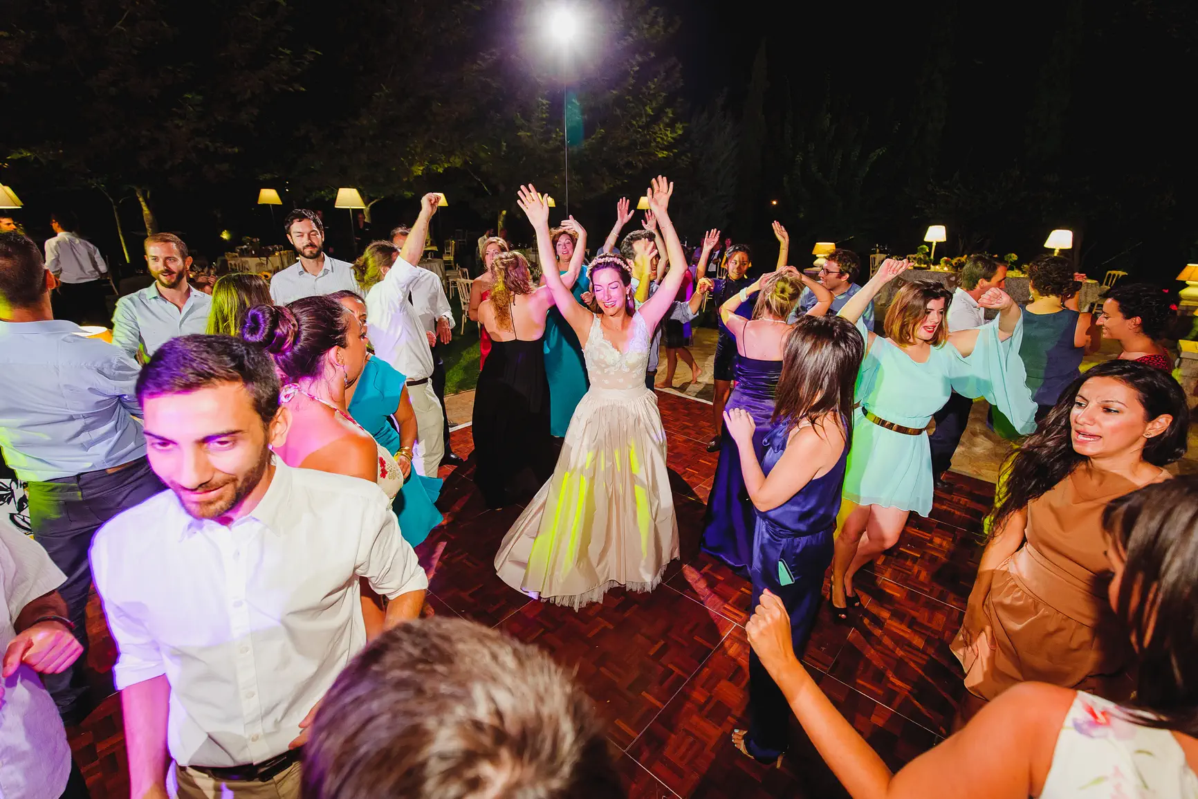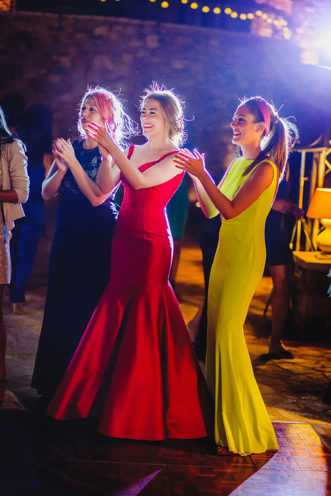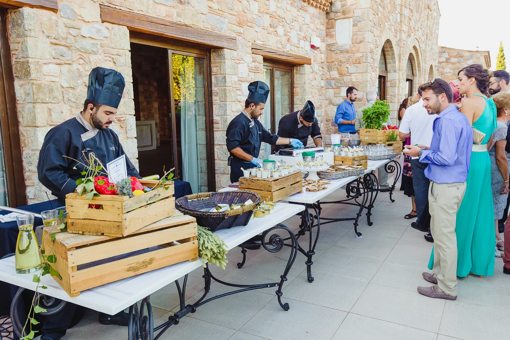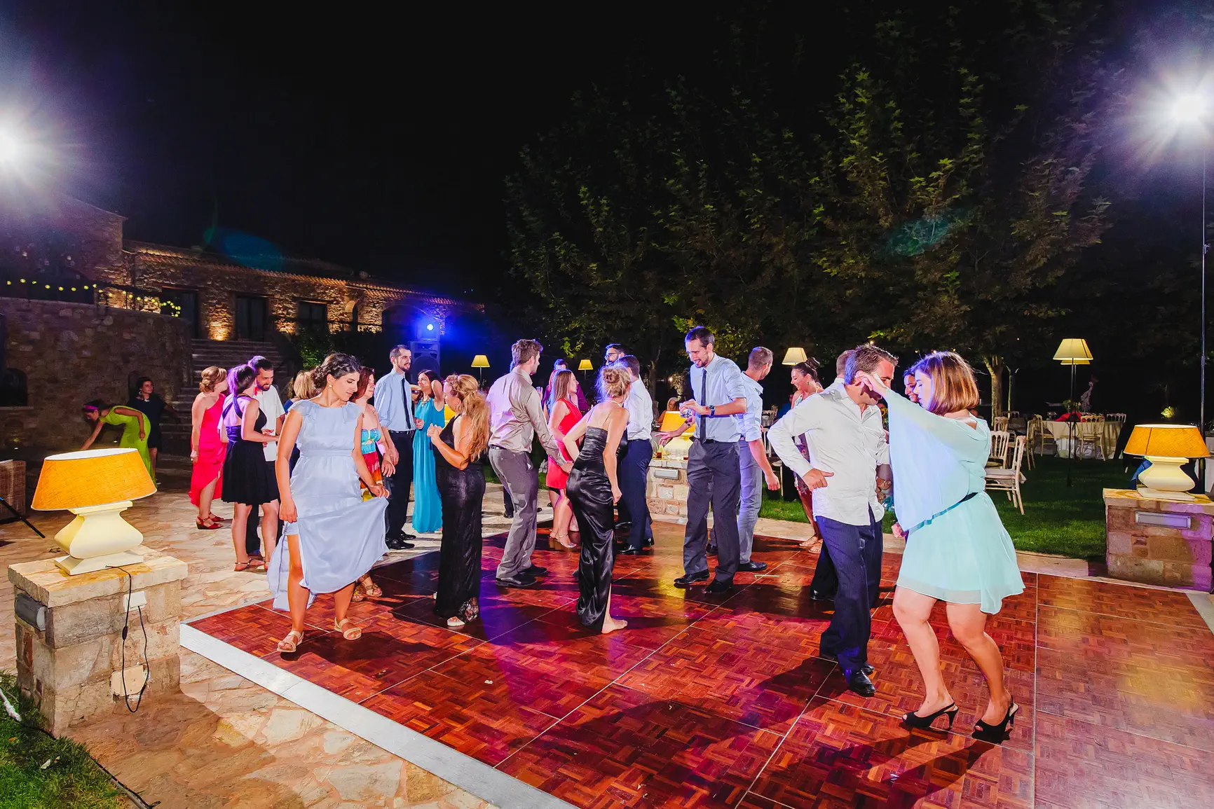 Immediately after the ceremony, the atmosphere became electric and the excitement ignited. A wild celebration began, with music flooding the lush gardens, calling everyone to dance. Laughter, wishes, and joyful voices merged into an endless rhythm as guests gave themselves over to absolute enjoyment. Exquisite food and fine drinks flowed abundantly, complementing the sense of unlimited bliss. Pyrgos Petreza vibrated with their liveliness, with dancing and singing continuing until the early morning hours.