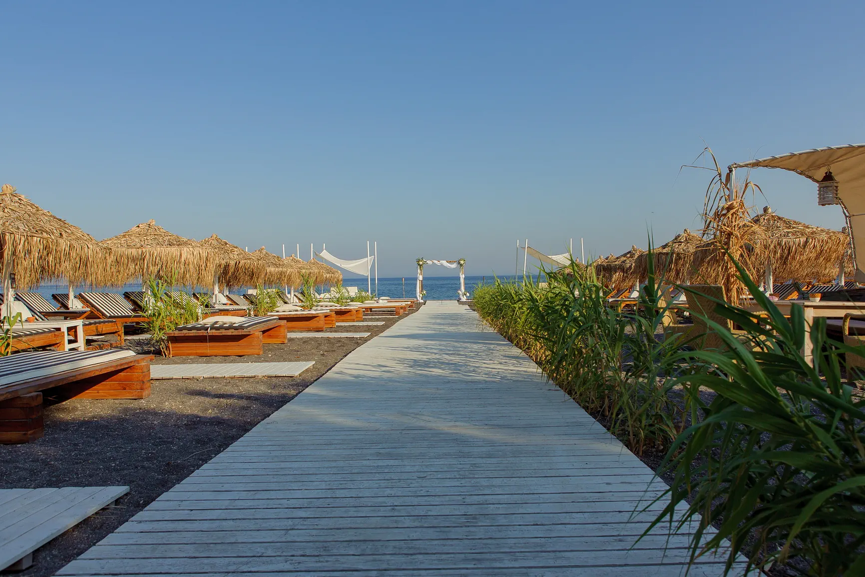 Ο γάμος της Stefi και του Ιάσονα στη Σαντορίνη ήταν μια συμφωνία αγάπης, ενορχηστρωμένη κάτω από τον αιγαιοπελαγίτικο ουρανό, μια μέρα όπου το όνειρο έγινε πραγματικότητα με φόντο την πιο δραματική ομορφιά. Η ημέρα τους ξεκίνησε σε μια ειδυλλιακή παραλία του νησιού, ένα σκηνικό απίστευτης φυσικής γοητείας, όπου μια κομψά στολισμένη αψίδα στεκόταν σαν πύλη προς την κοινή τους ζωή, με το απέραντο γαλάζιο της θάλασσας να απλώνεται μπροστά τους.