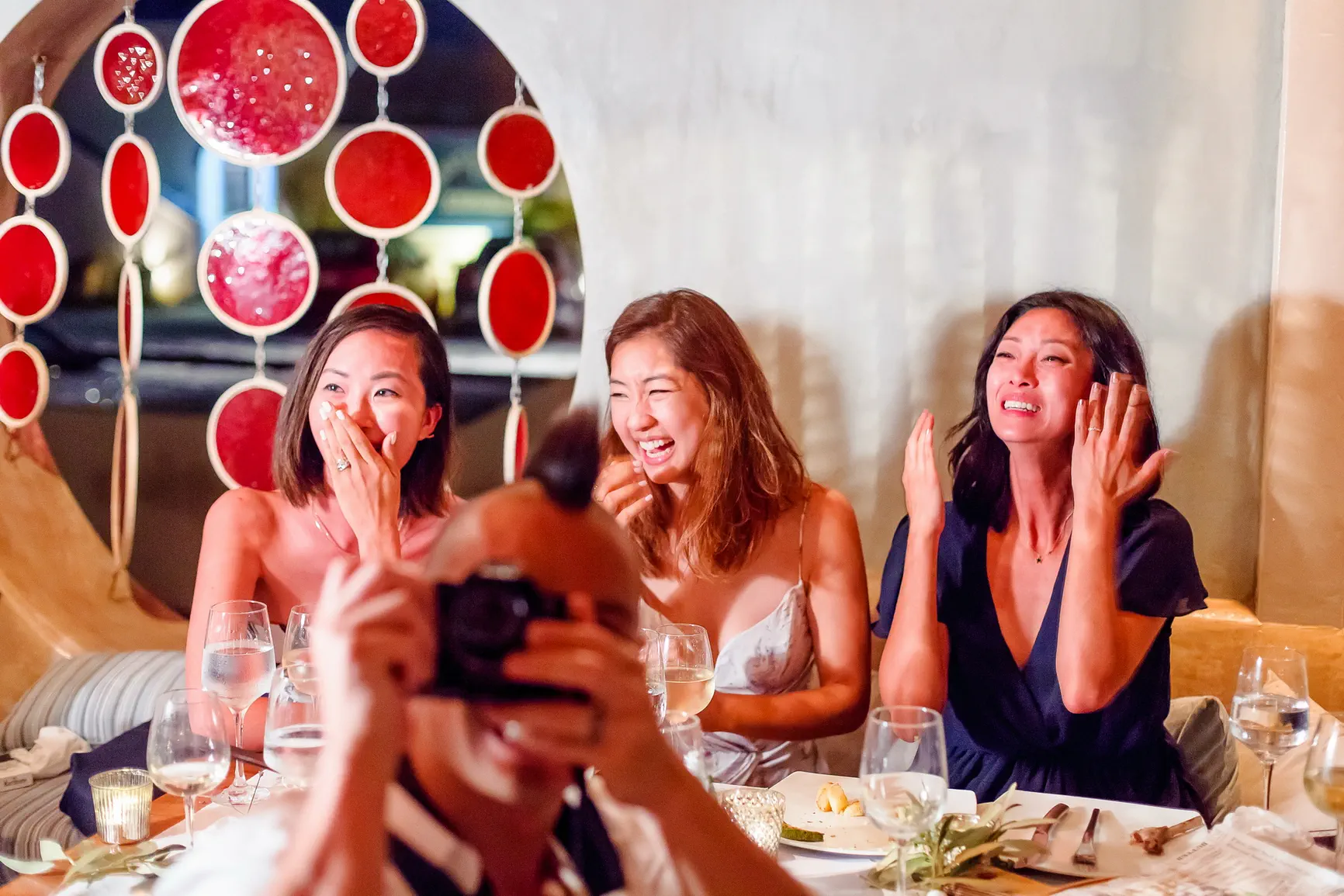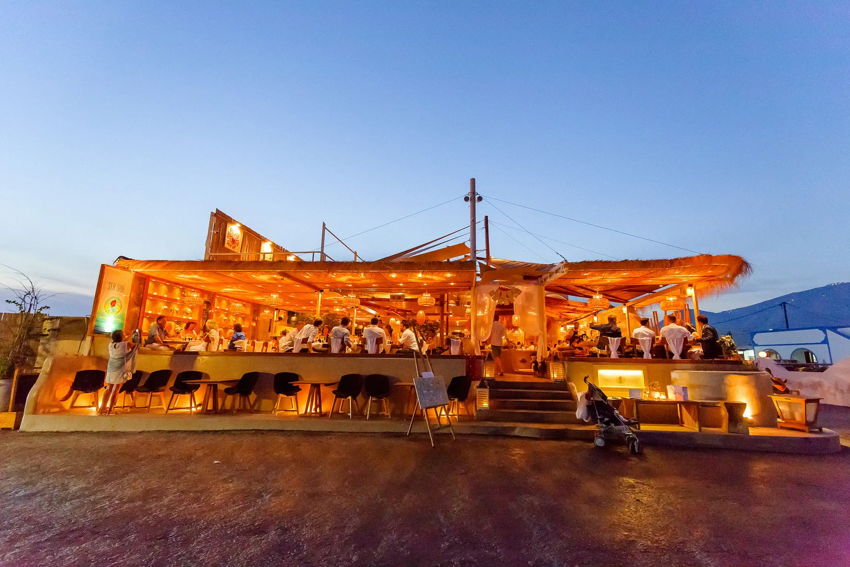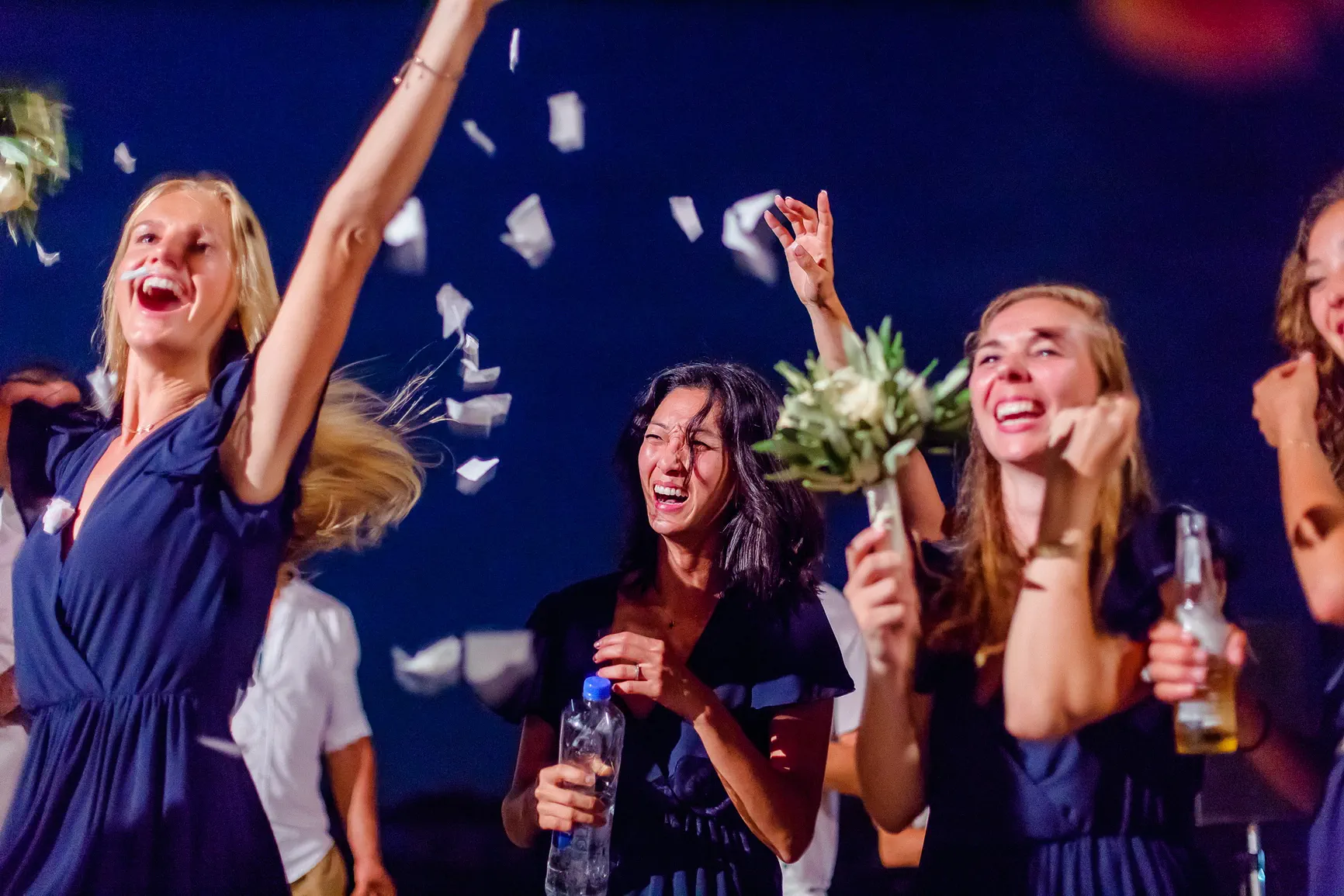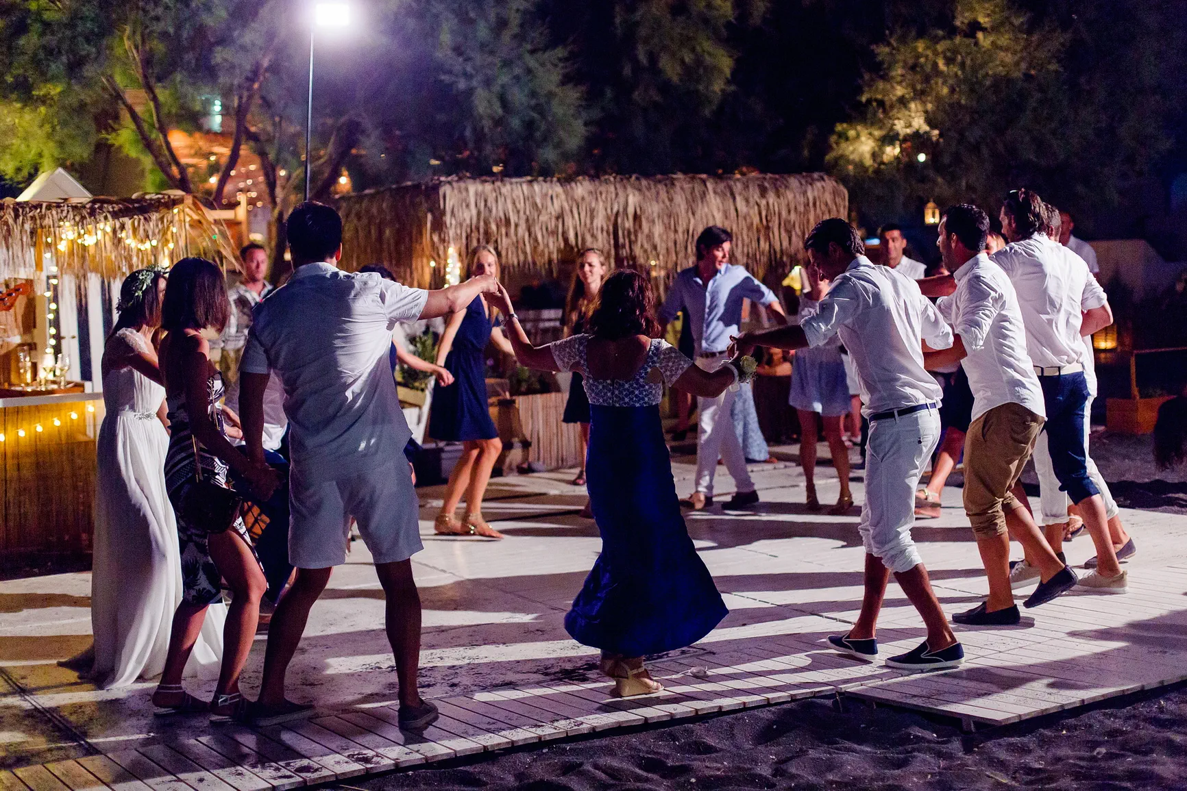 Καθώς η νύχτα έπεφτε, η μαγεία μεταμορφώθηκε. Η δεξίωση που ακολούθησε ήταν κυριολεκτικά λουσμένη στο φως της πανσελήνου. Το ολόγιομο φεγγάρι αναδύθηκε στον ουρανό, ρίχνοντας την ασημένια του λάμψη πάνω από την καλντέρα και τη θάλασσα, δημιουργώντας μια ατμόσφαιρα βγαλμένη από παραμύθι. Κάτω από αυτό το μαγικό φως, στήθηκε ένα αξέχαστο γλέντι. Τα γέλια, η μουσική, ο χορός, οι προπόσεις κάτω από τα αστέρια και το φεγγάρι δημιούργησαν μια ατμόσφαιρα απόλυτου ρομαντισμού και χαράς. Η ενέργεια ήταν μοναδική, ένας συνδυασμός της κομψότητας της Σαντορίνης και της αυθεντικής ευτυχίας του ζευγαριού και των καλεσμένων τους.