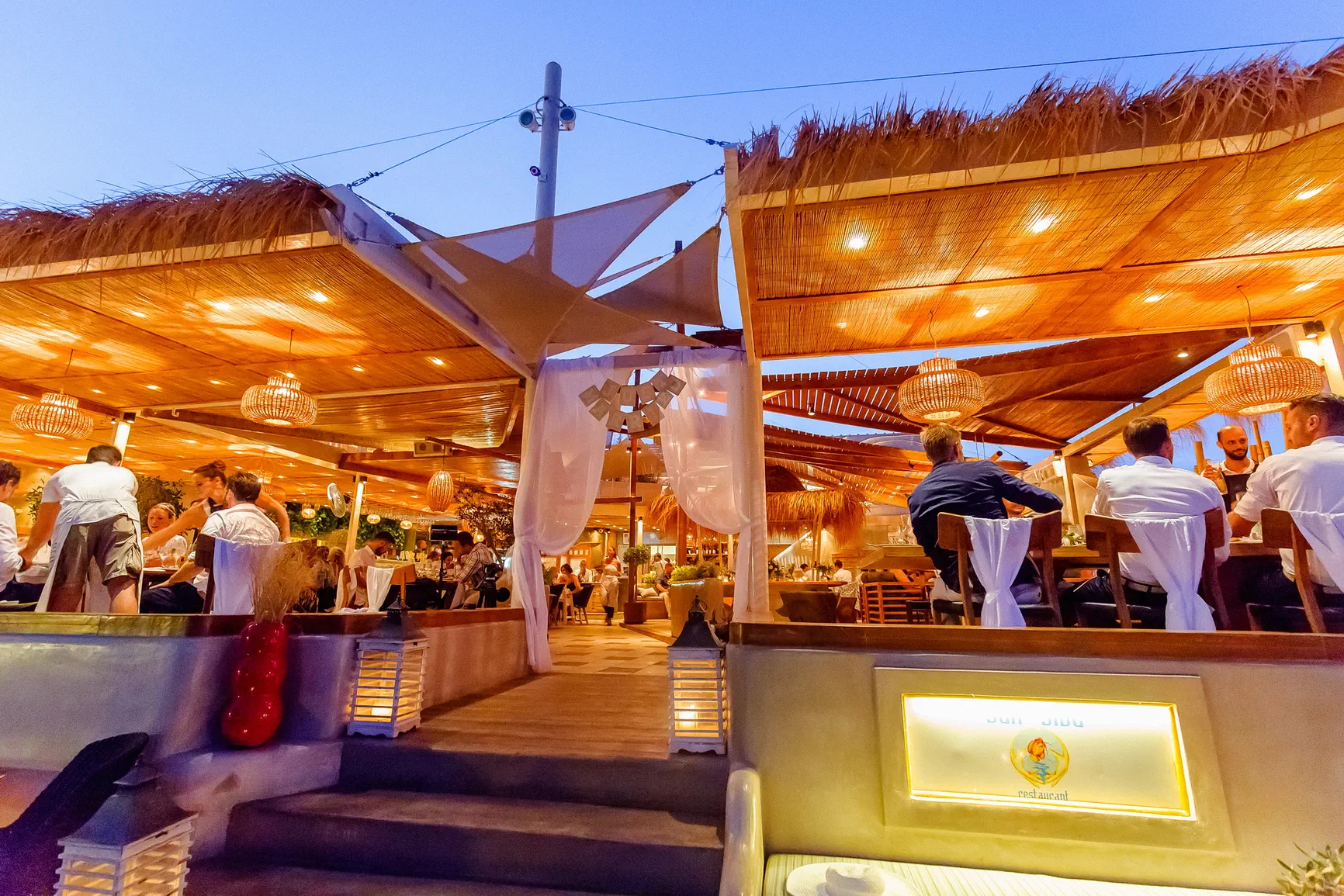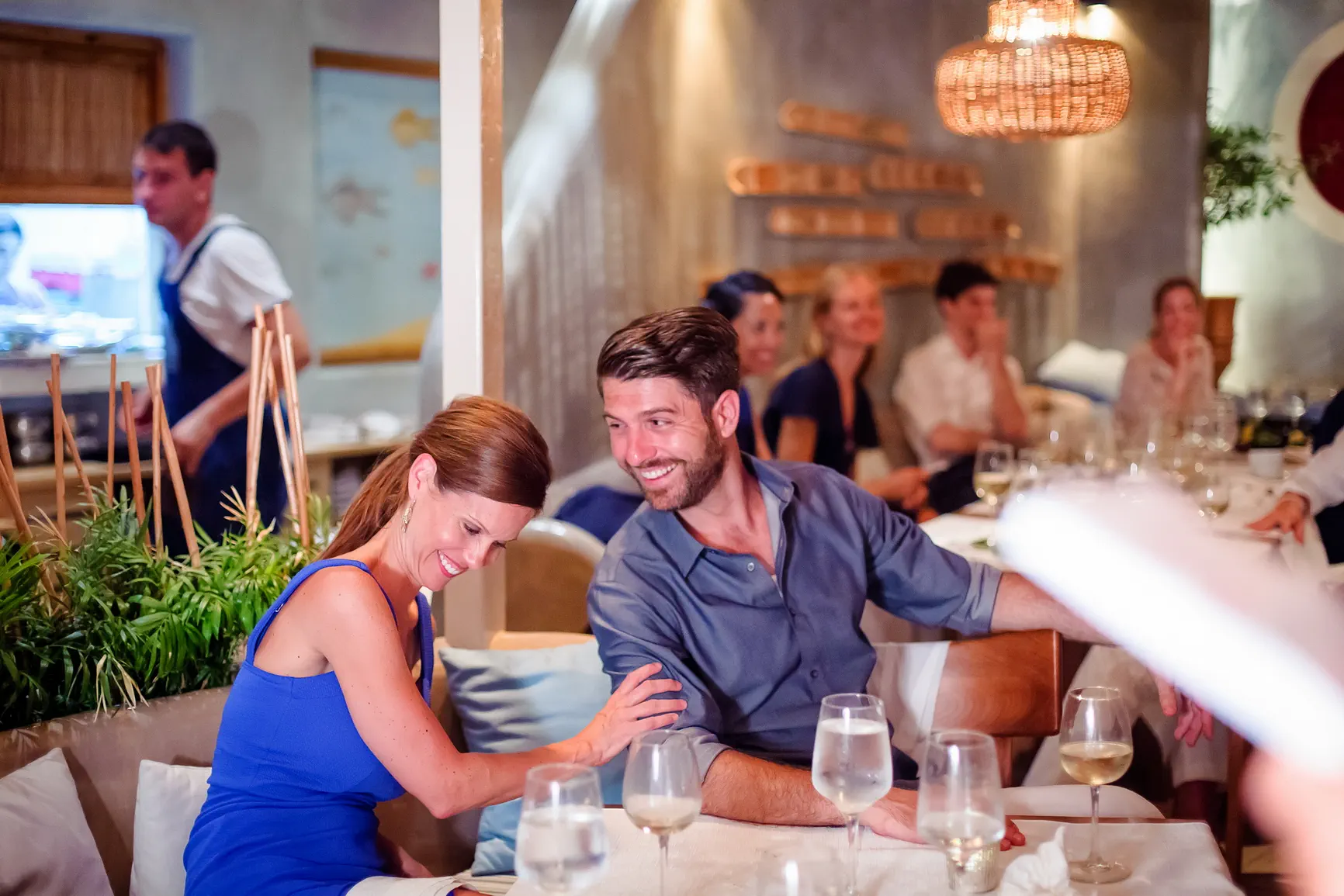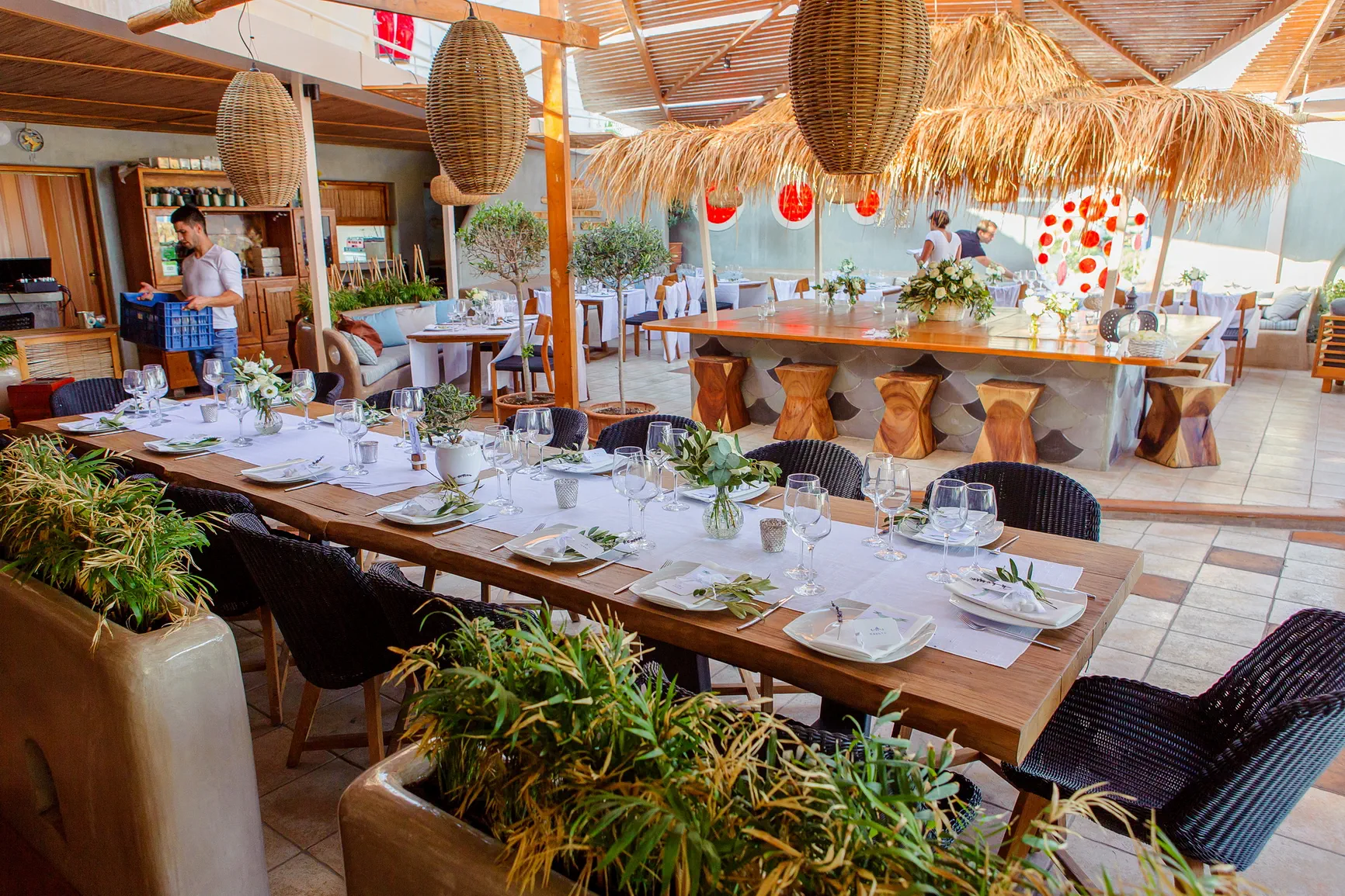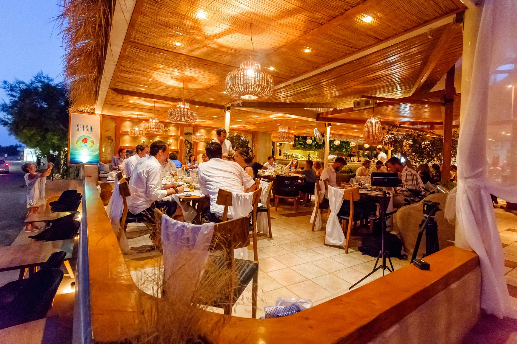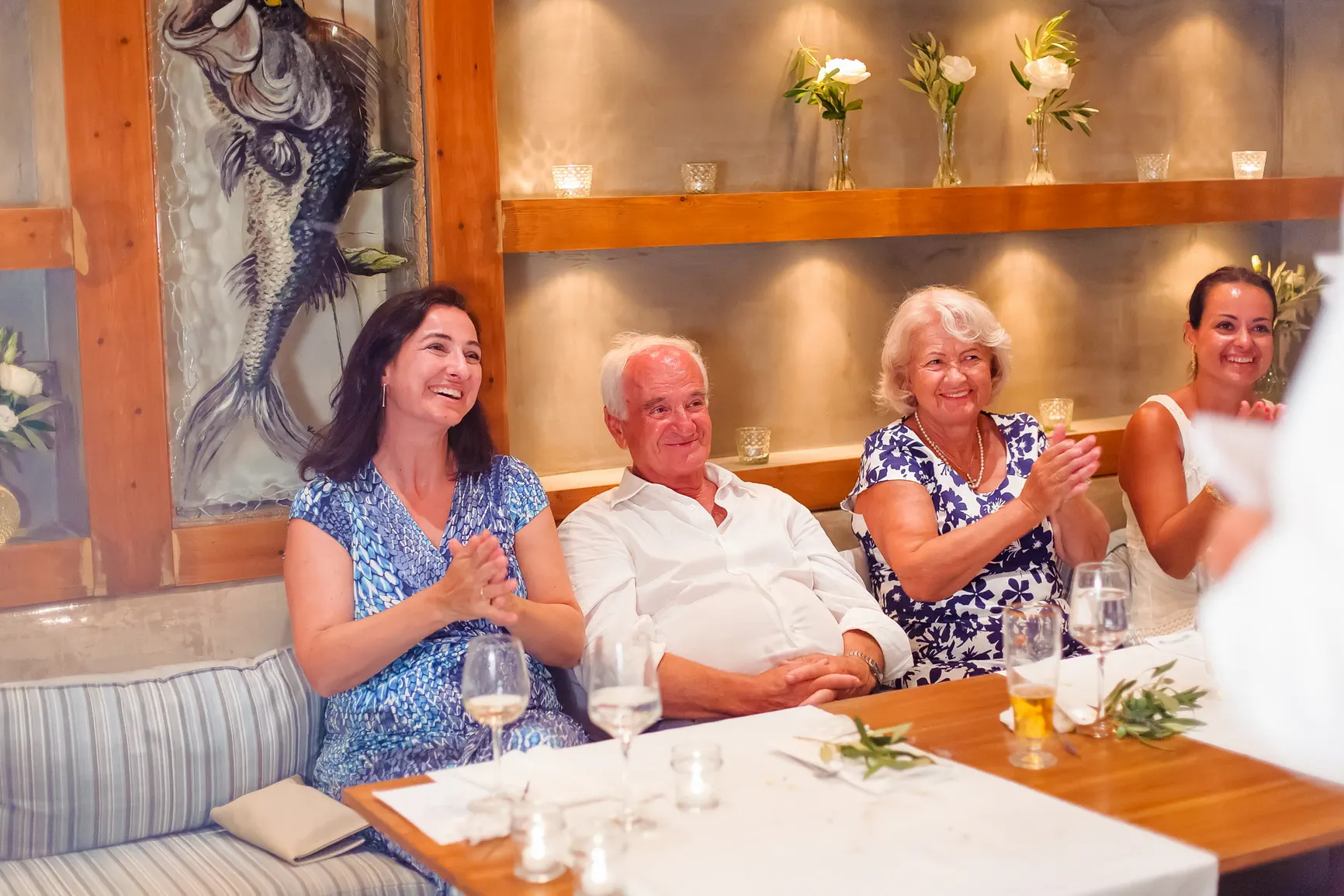 Καθώς η νύχτα έπεφτε, η μαγεία μεταμορφώθηκε. Η δεξίωση που ακολούθησε ήταν κυριολεκτικά λουσμένη στο φως της πανσελήνου. Το ολόγιομο φεγγάρι αναδύθηκε στον ουρανό, ρίχνοντας την ασημένια του λάμψη πάνω από την καλντέρα και τη θάλασσα, δημιουργώντας μια ατμόσφαιρα βγαλμένη από παραμύθι. Κάτω από αυτό το μαγικό φως, στήθηκε ένα αξέχαστο γλέντι. Τα γέλια, η μουσική, ο χορός, οι προπόσεις κάτω από τα αστέρια και το φεγγάρι δημιούργησαν μια ατμόσφαιρα απόλυτου ρομαντισμού και χαράς. Η ενέργεια ήταν μοναδική, ένας συνδυασμός της κομψότητας της Σαντορίνης και της αυθεντικής ευτυχίας του ζευγαριού και των καλεσμένων τους.