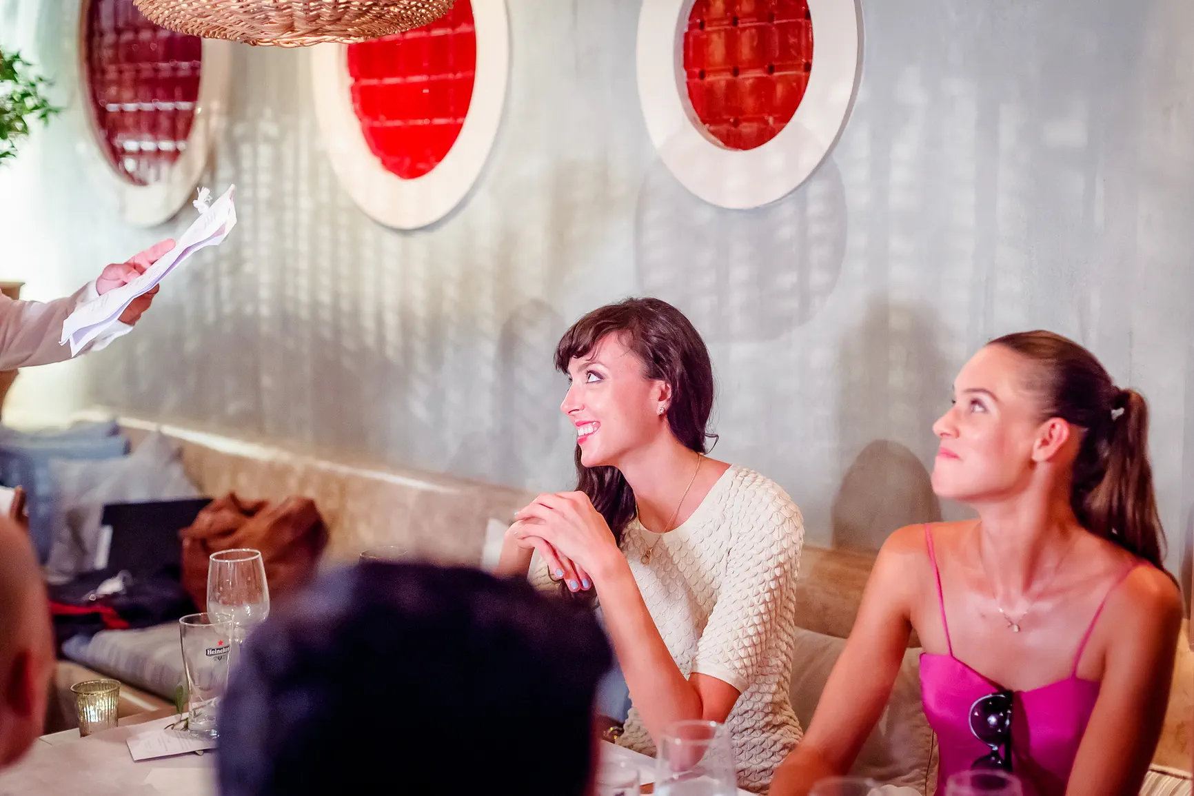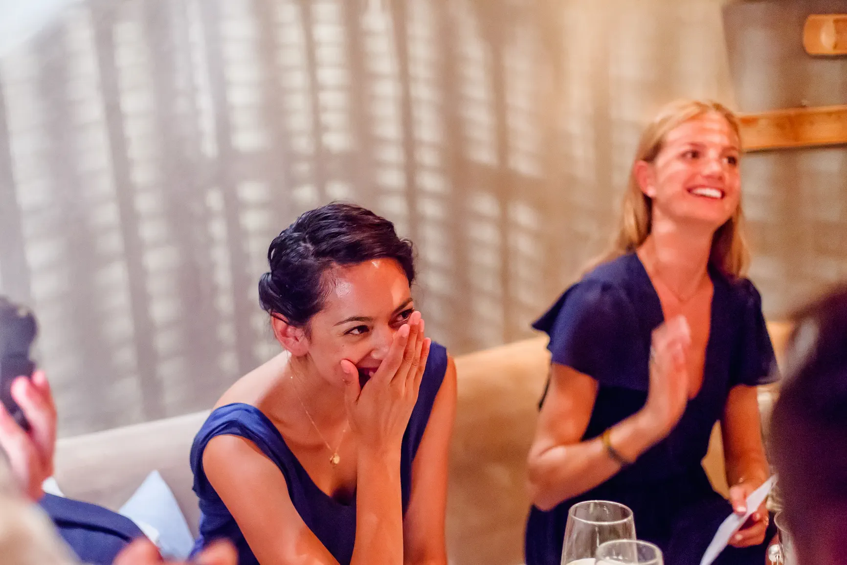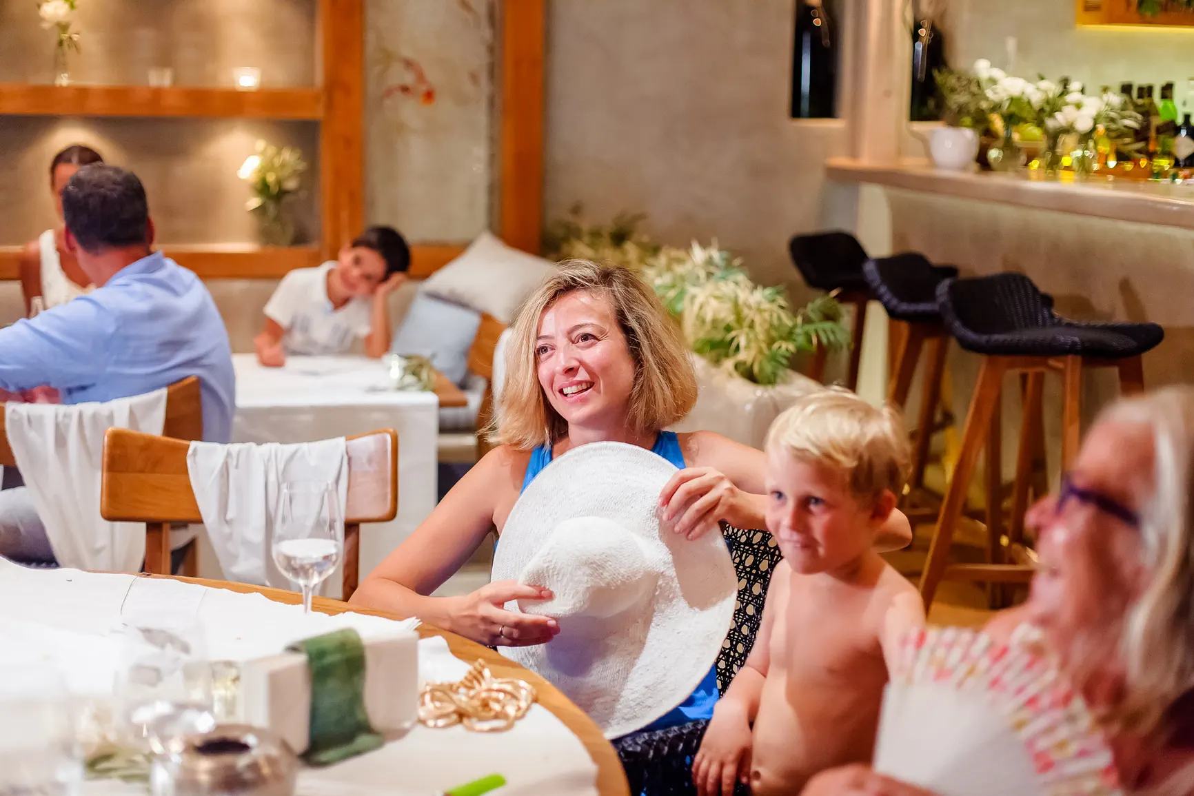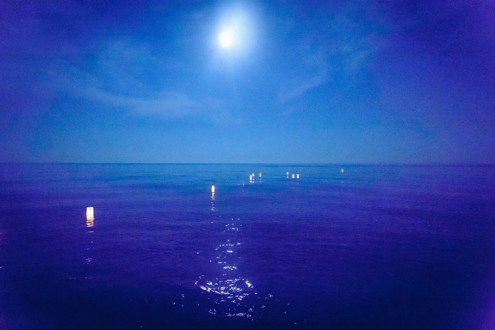 Καθώς η νύχτα έπεφτε, η μαγεία μεταμορφώθηκε. Η δεξίωση που ακολούθησε ήταν κυριολεκτικά λουσμένη στο φως της πανσελήνου. Το ολόγιομο φεγγάρι αναδύθηκε στον ουρανό, ρίχνοντας την ασημένια του λάμψη πάνω από την καλντέρα και τη θάλασσα, δημιουργώντας μια ατμόσφαιρα βγαλμένη από παραμύθι. Κάτω από αυτό το μαγικό φως, στήθηκε ένα αξέχαστο γλέντι. Τα γέλια, η μουσική, ο χορός, οι προπόσεις κάτω από τα αστέρια και το φεγγάρι δημιούργησαν μια ατμόσφαιρα απόλυτου ρομαντισμού και χαράς. Η ενέργεια ήταν μοναδική, ένας συνδυασμός της κομψότητας της Σαντορίνης και της αυθεντικής ευτυχίας του ζευγαριού και των καλεσμένων τους.