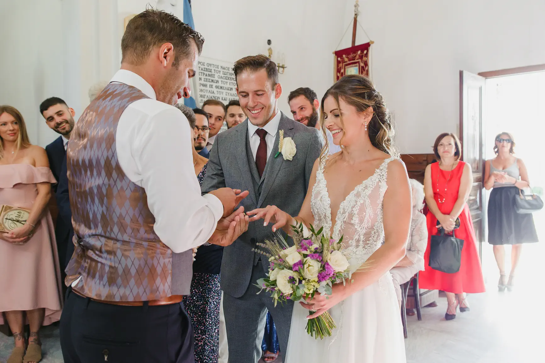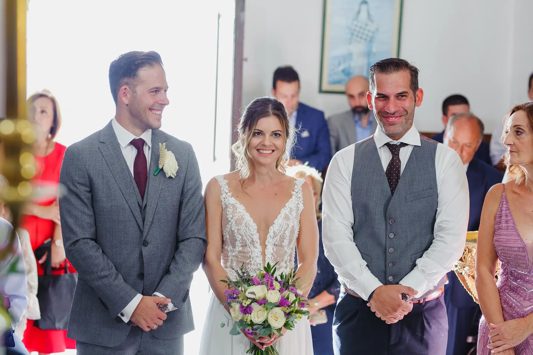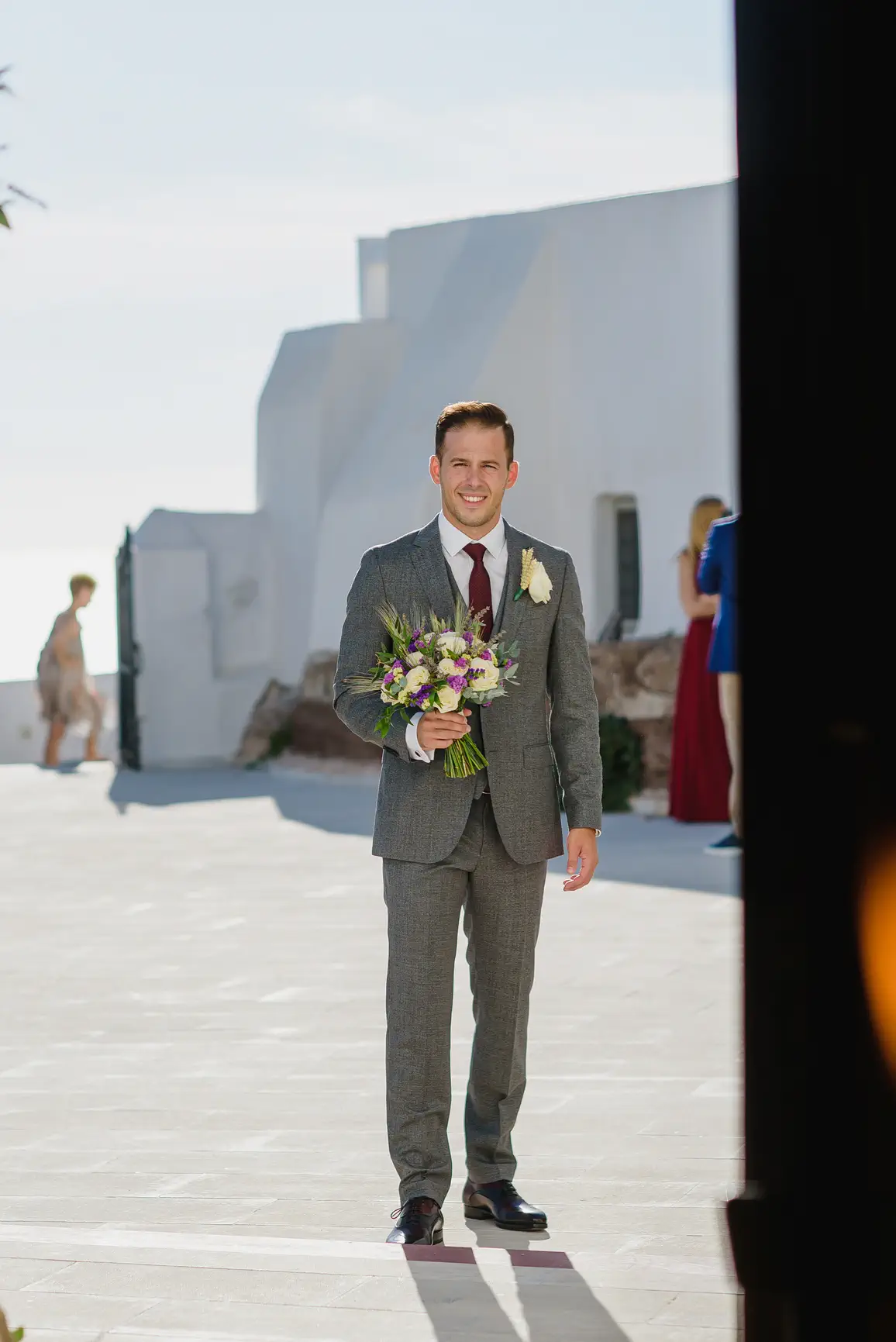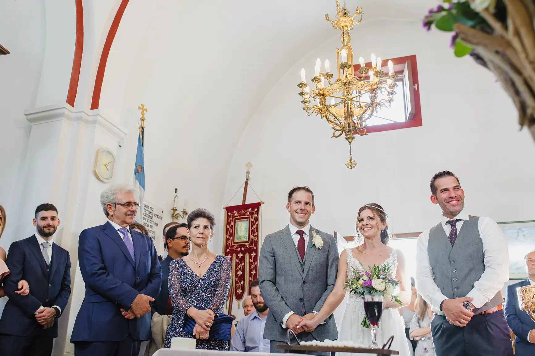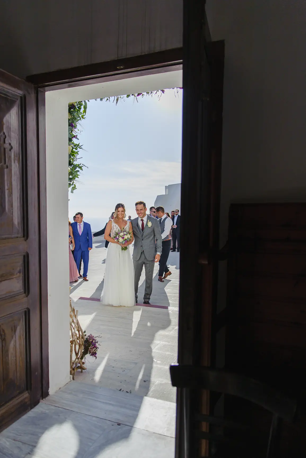 Η τελετή πραγματοποιήθηκε στην εμβληματική εκκλησία της Ανάστασης στο Ημεροβίγλι, ένα σημείο με θέα που κυριολεκτικά κλέβει την καρδιά. Με τον χαρακτηριστικό γαλάζιο τρούλο να δεσπόζει και την Καλντέρα να απλώνεται στα πόδια τους, το ζευγάρι αντάλλαξε όρκους αιώνιας πίστης και αφοσίωσης. Η άφιξη της πανέμορφης Κατερίνας, λουσμένη στο φως του κυκλαδίτικου ήλιου, ήταν μια στιγμή απαράμιλλης ομορφιάς, ενώ ο Ηλίας την υποδέχτηκε με βλέμμα γεμάτο λατρεία. Η συγκίνηση ήταν διάχυτη, καθώς οι καλεσμένοι παρακολουθούσαν την ιερή στιγμή με φόντο ένα από τα πιο όμορφα τοπία του κόσμου.