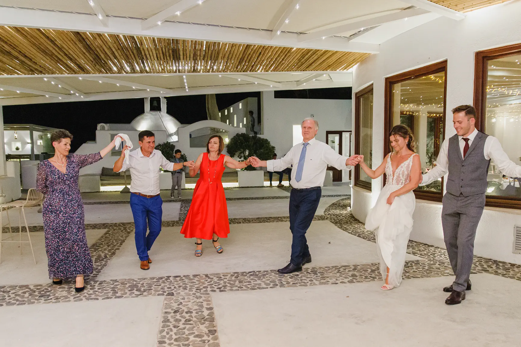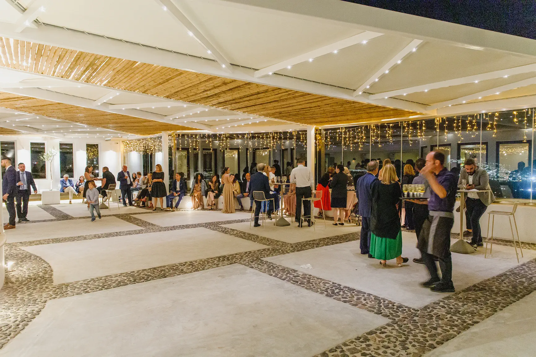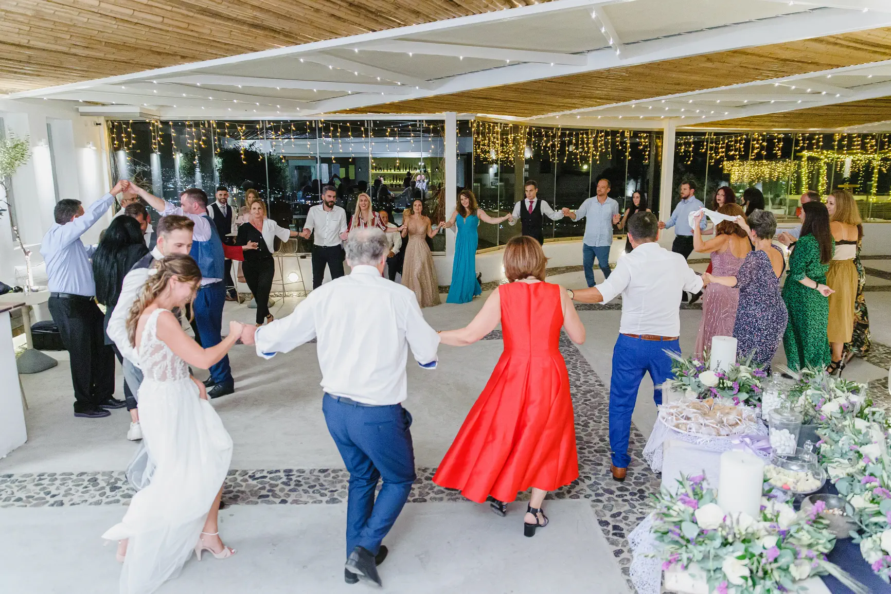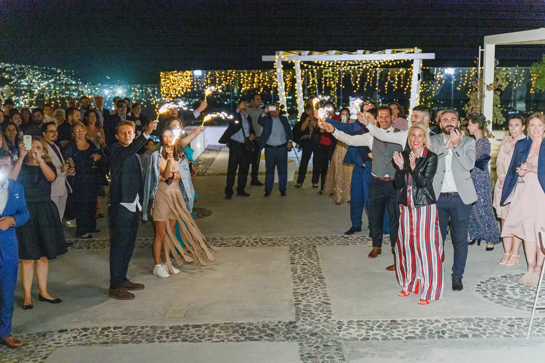 Η γιορτή της αγάπης τους συνεχίστηκε στον Πύργο, έναν χώρο που προσφέρει πανοραμική θέα σε όλο το νησί και συνδυάζει την παραδοσιακή γοητεία με την κομψότητα. Καθώς ο ήλιος έδυε, βάφοντας τον ουρανό με απίστευτα χρώματα, η δεξίωση ξεκίνησε. Η ατμόσφαιρα ήταν γεμάτη κέφι, ζωντάνια και αυθεντική ελληνική φιλοξενία. Ο χορός, η μουσική, οι γεύσεις και τα αμέτρητα χαμόγελα δημιούργησαν μια αξέχαστη βραδιά κάτω από τον έναστρο ουρανό της Σαντορίνης. Ο Ηλίας και η Κατερίνα, πιο ευτυχισμένοι από ποτέ, μοιράστηκαν τη χαρά τους με τους αγαπημένους τους.
